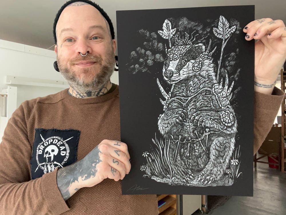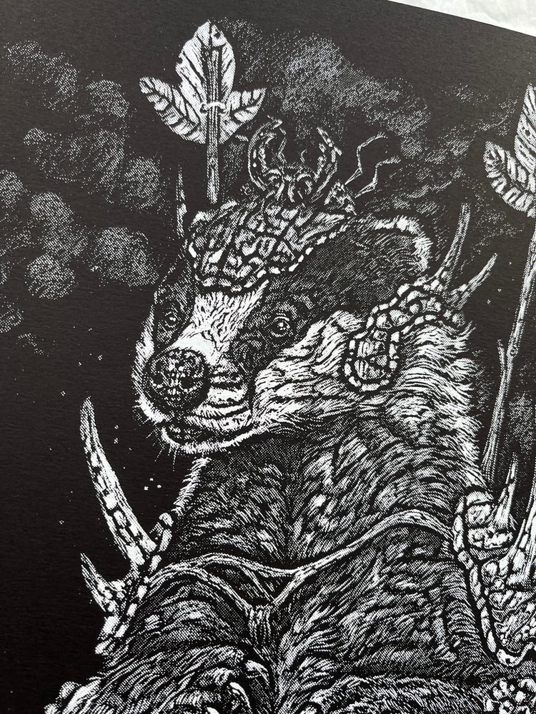 Depicting a badger from The Books of Orata, wearing the tools of their trade