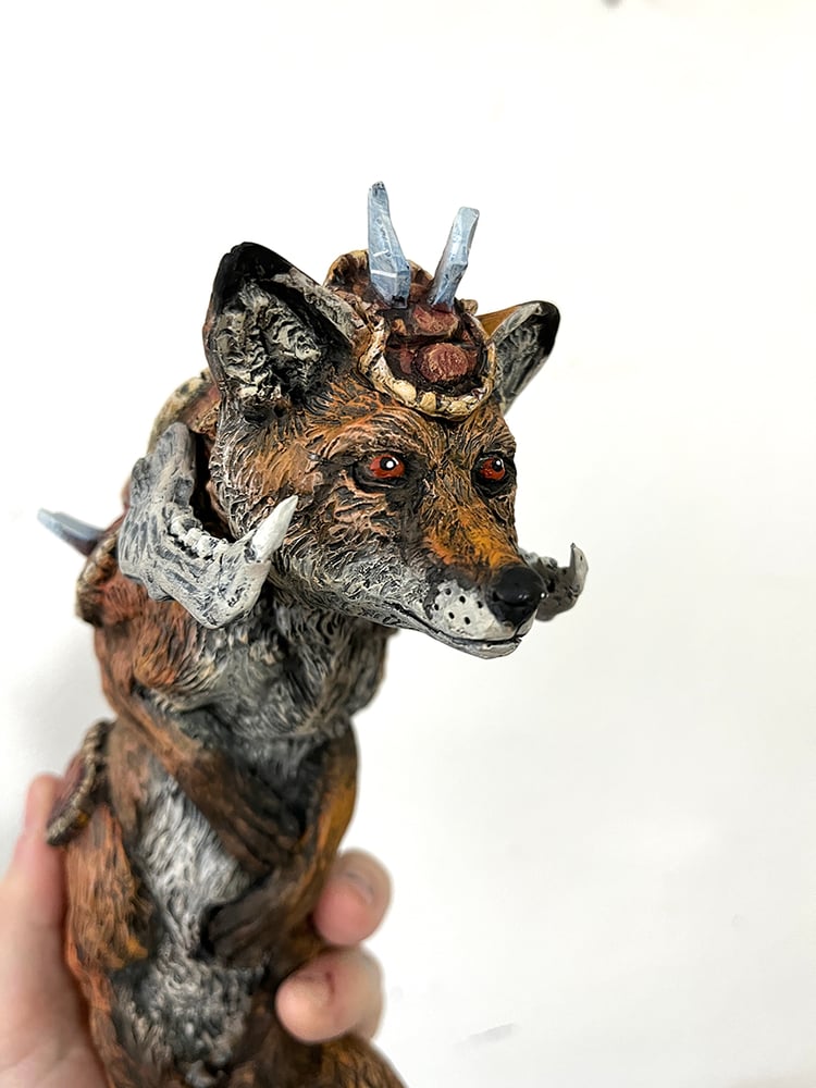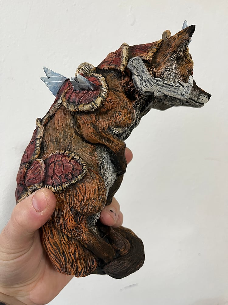 Hand sculpted, hand cast and hand painted statue of Vorsa Corpse Speaker, one of the main characters in my animal mythology novels. She is a fox, bedecked in armour made of bone and glass. She has removable head armour.